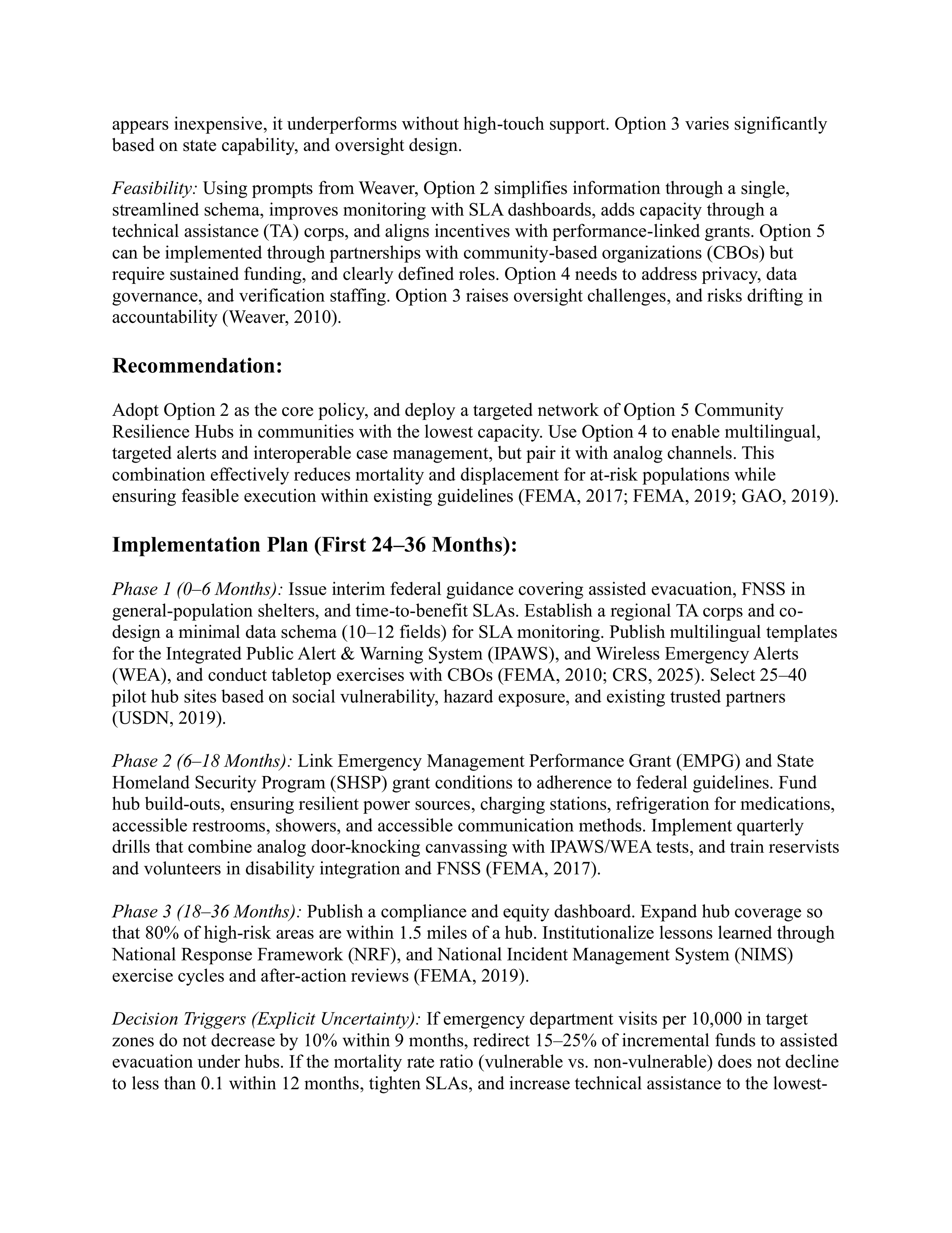 The final recommendation was to adopt Option 2 as the policy backbone, supplement it with Option 5 in low-capacity communities, and use Option 4 as an enabling tool rather than a substitute for institutional support. This package was judged to offer the strongest and most reliable reductions in mortality and displacement, along with meaningful equity gains and manageable implementation risk.