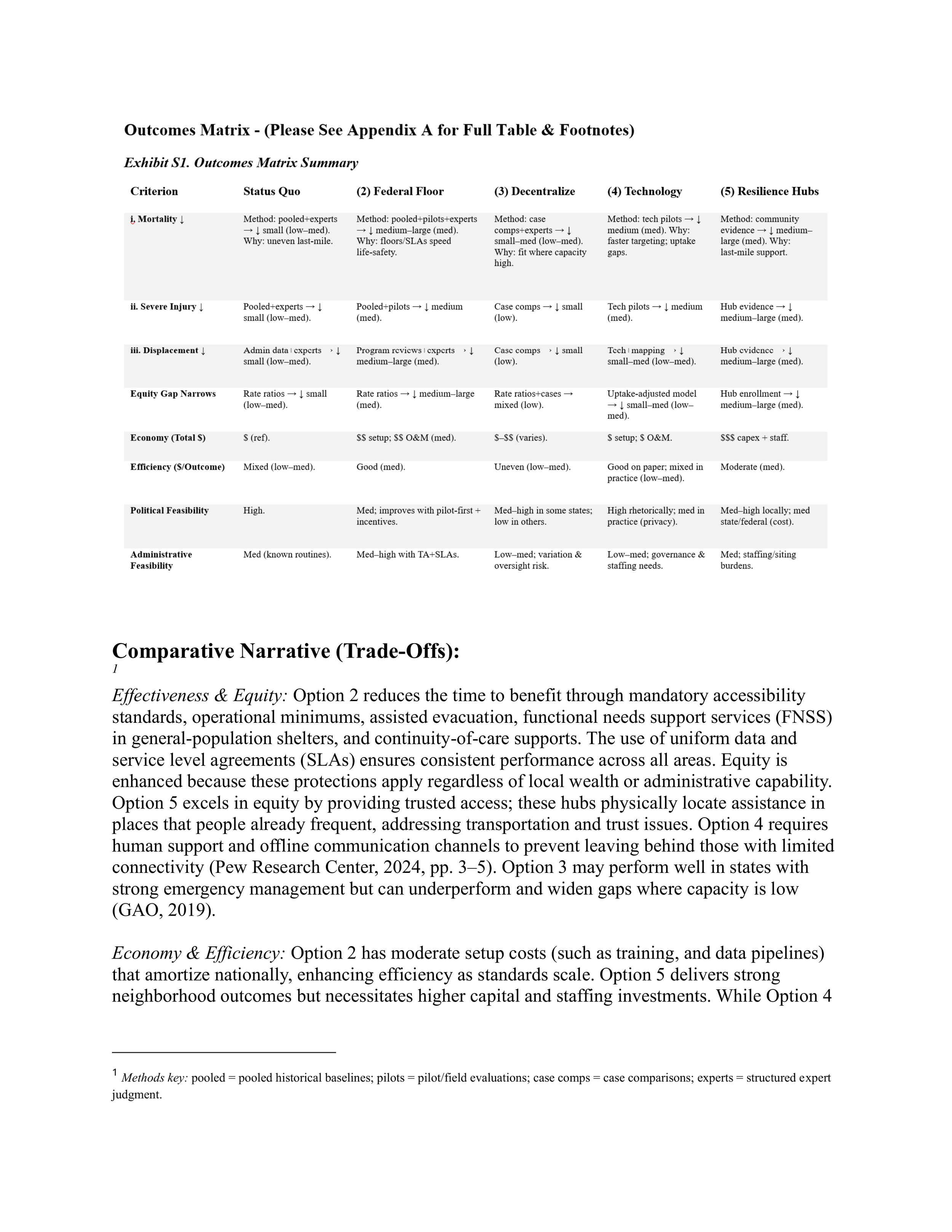 These options were compared using five core criteria: effectiveness, equity, economy, efficiency, and feasibility. The analysis also used logic models, outcomes-matrix reasoning, and implementation prompts to surface risks, assumptions, and likely trade-offs.