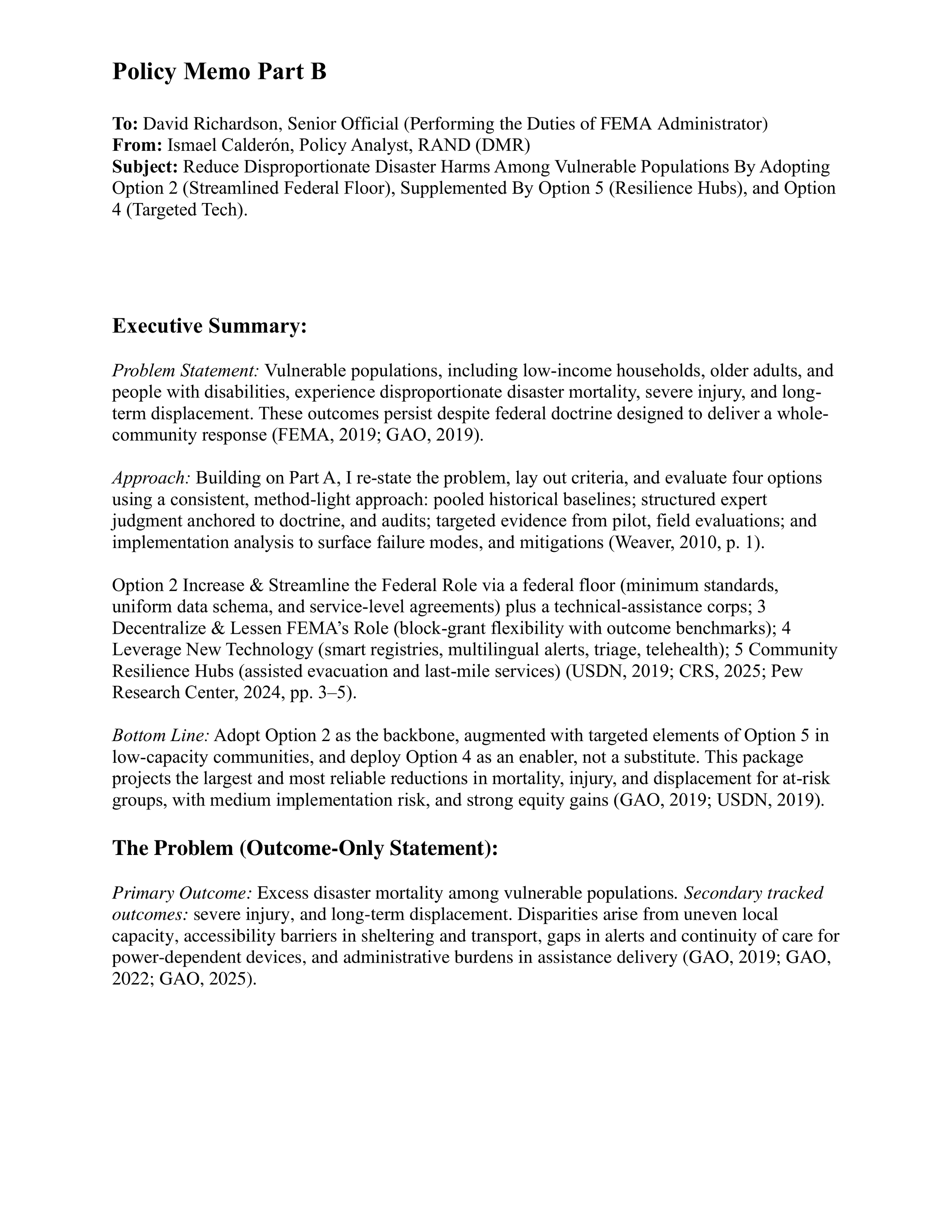 This project examined a central public-policy challenge: vulnerable populations—including low-income households, older adults, and people with disabilities—experience disproportionate disaster mortality, severe injury, and long-term displacement. The analysis focused on how policy design, implementation structure, and federal coordination can reduce preventable harms before and during disasters.